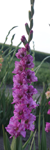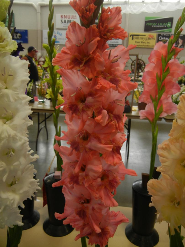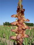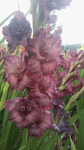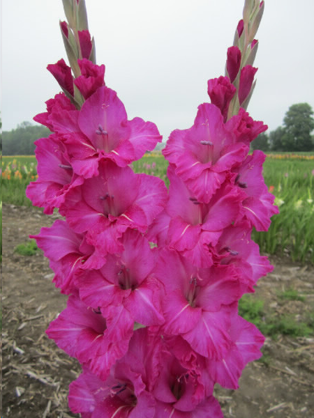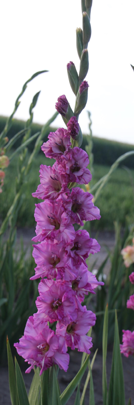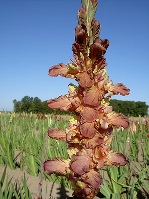 19-10 Eli P-32 396 John Alleman plum colored with salmon highlights throughout 3-1/2" floret, 20 buds, 7 open, 7 in color Flowerhead 28" Field height 48" Early Alleman Gladiolus |