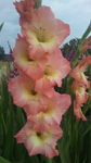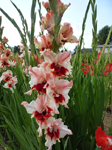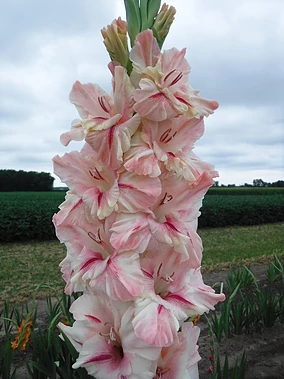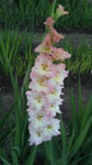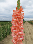 19-14 Pescadero Paint L-32 343 John Alleman Jilly X Norma J light pink salmon with an orange brown blotch on the lower petals and some on the upper petals 4-1/" floret, 22 buds, 8 open, 6 in color Flowerhead 28" Field height 58" Mid season Alleman Gladiolus |