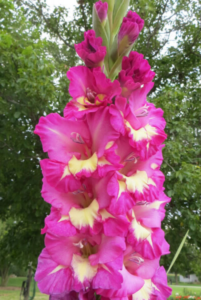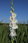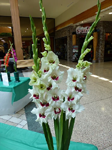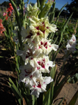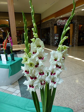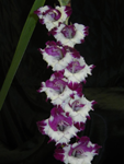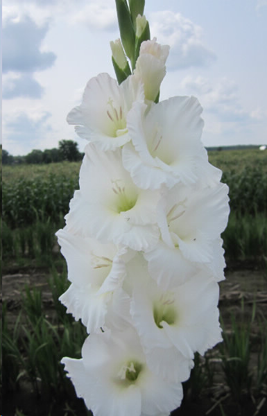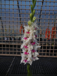 19-15 Spiked N-111 201 John Alleman Brenda Jo X Sensation white with dark raspberry dart in the lip petals 3-3/4" floret, 21 buds, 7 open, 7 in color Flowerhead 20" Field height 43" Early Alleman Gladiolus |