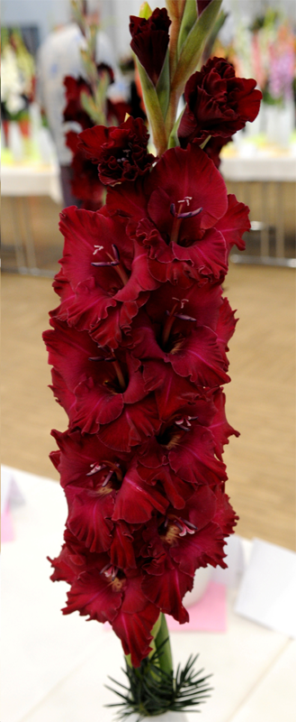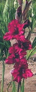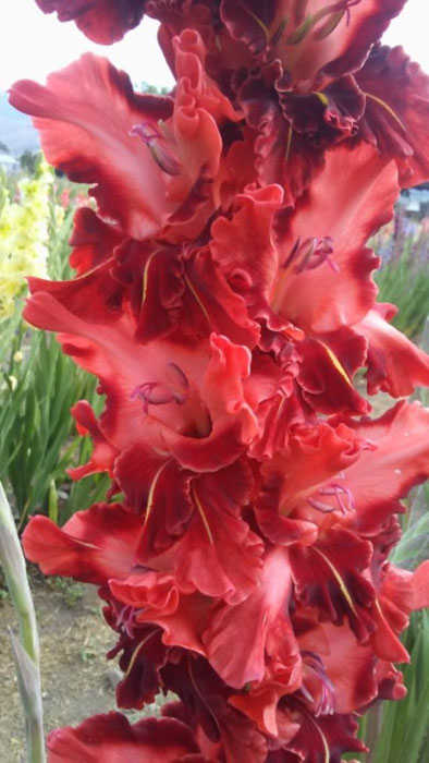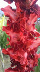 19-13 Jonathan AJ-125 455 John Alleman Shadow Dancer X Lori B Dark red with lighter red in the upper petals and a fine yellow line in the lip petals 4-1/2" floret, 24 buds, 12 open, 7 in color Flowerhead 28" Field height 50" Mid season Alleman Gladiolus |
