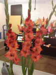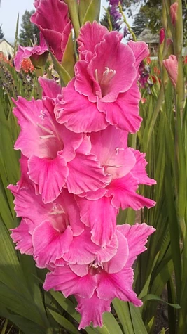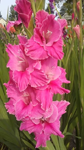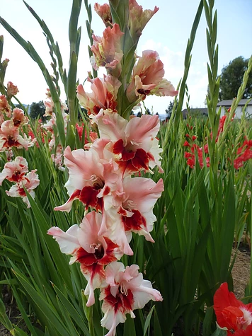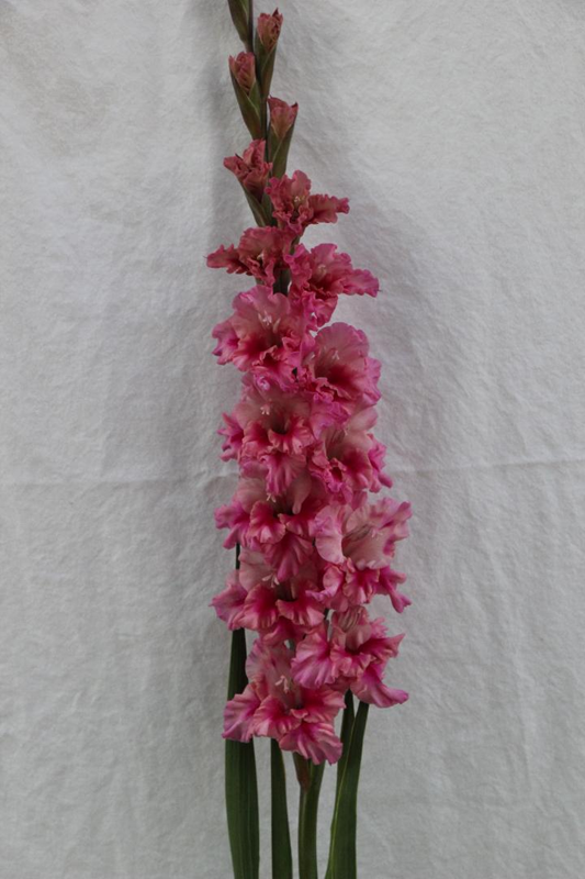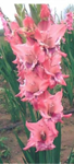 19-38 Too Sexy 12-204 335 Cliff Hartline Hot Pink X Sweet Caroline medium salmon with white inner petal with rose in throat 4" floret, 24 buds, 12 open, 7 in color Flowerhead 23" Field height 50" 75 days Pleasant Valley Glads |