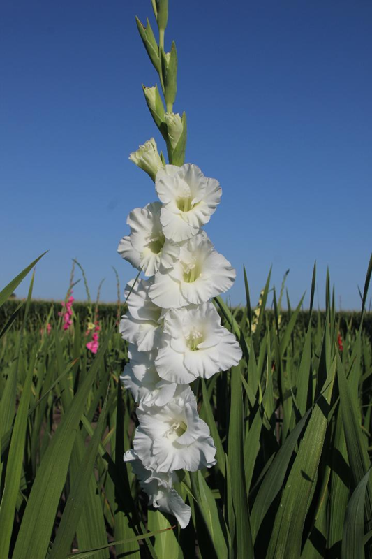 19-25 Magical Morning 301 JM 298-13 John Meyer Bernice Cream X unknown pure white with bright rose blotch and deeper rose mid-rib spear 4-1/2" floret, 27 buds, 8 open, 6 in color Flowerhead 28" Field height 60" 81 days Honker Flats |