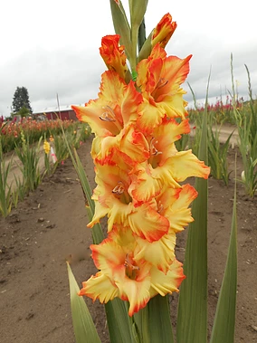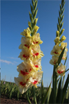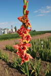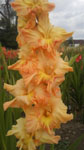 19-32 Fiery 16-78 425 Cliff Hartline Gold Finger X Emerald Spring orange on tips medium yellow fading to orange throat 4-3/4" floret, 21 buds, 8 open, 4 in color Flowerhead 22" Field height 48" 80 days Pleasant Valley Glads |