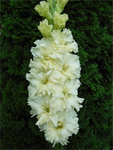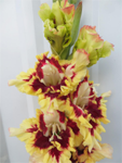 19-12 Jive N-28 211 John Alleman Fire Frenzy X Sensation ruffled cream with a purple dart in the throat of most of the petals 2-1/2" floret, 21 buds, 8 open, 6 in color Flowerhead 22" Field height 48" Early Alleman Gladiolus |