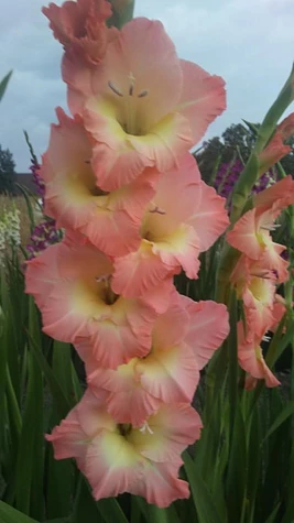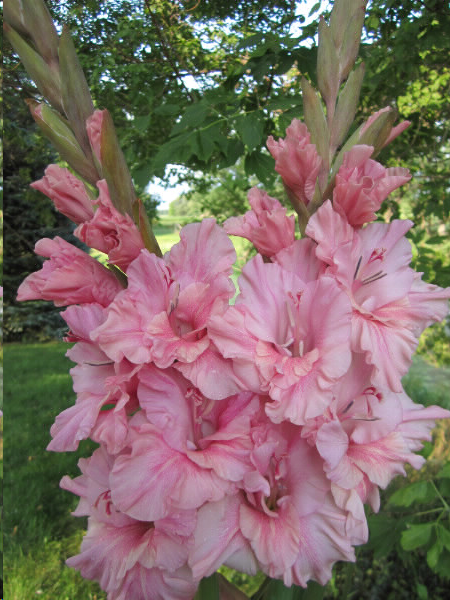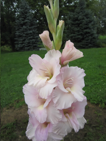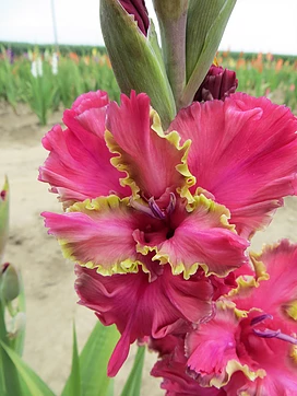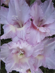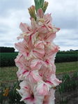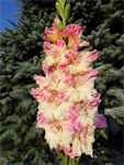 19-11 Entice N-58 463 John Alleman Impression X Magic Moment ruffled light rose with light yellow lip petal 5" floret, 22 buds, 8 open, 6 in color Flowerhead 30" Field height 52" Mid season Alleman Gladiolus |