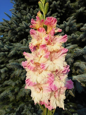 19-37 Strawberry Cream 15-111 343 Cliff Hartline Bi Blue X Joyueses Entree cream with medium pink petal tips, blending into the cream center 4-1/4" floret, 21 buds, 9 open, 6 in color Flowerhead 20" Field height 46" 80 days Pleasant Valley Glads |