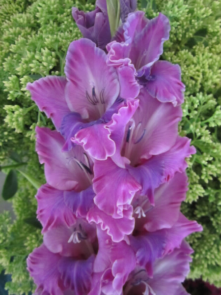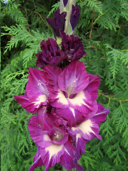 19-16 The Grape Escape 479 Reg & Marlene Powys-Lybbe Lady Susan X (Astral Faye X Violka) ruffled purple with darker lip petal 4-1/2 floret, 21 buds, 8 open, 4 in color Flowerhead 28" Field height 50" Mid season Alleman Gladiolus |